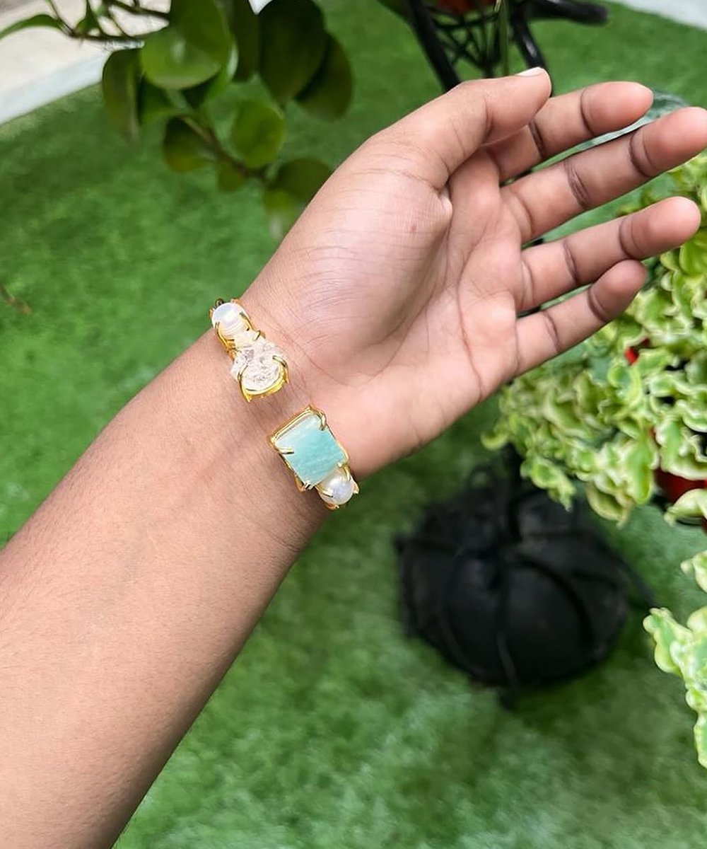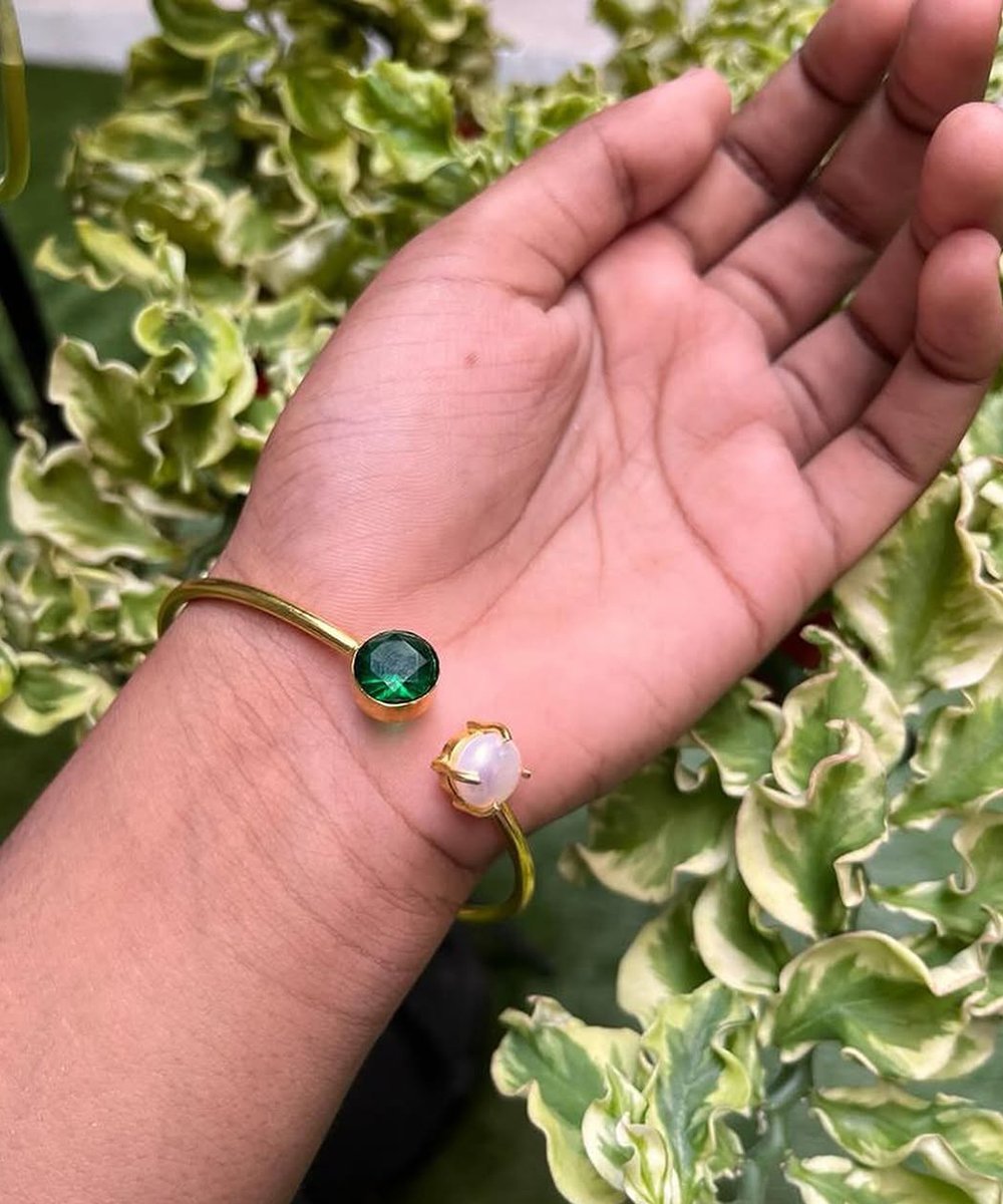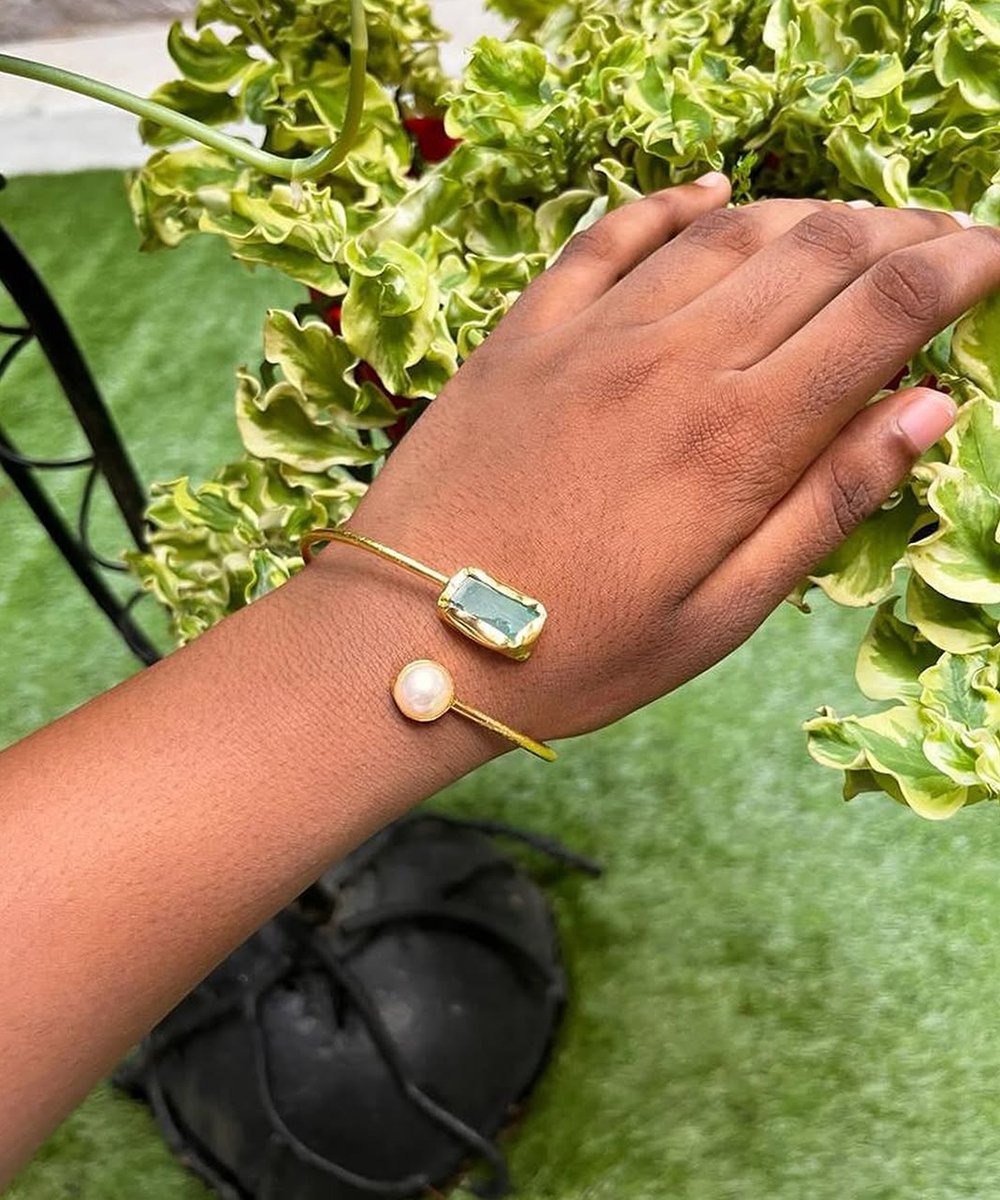Stylish Adjustable Brass Bangle featuring beautiful stone and pearl accents. A perfect blend of elegance and tradition for any occasion.